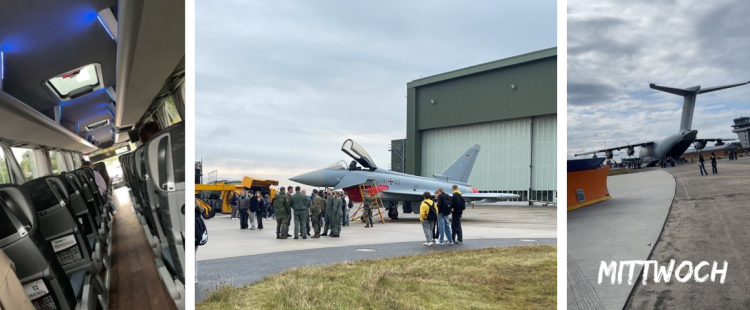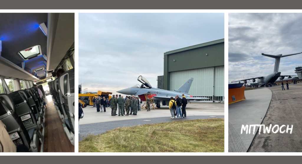 - Am 1. Tag der Uniformberufe hatten wir die Möglichkeit, verschiedene Berufe im Bereich der Bundeswehr, Polizei, Feuerwehr und weiteren uniformierten Diensten kennenzulernen. Der Tagesablauf war klar strukturiert: Um 7:50 Uhr trafen wir uns an der Schule. Um 8:00 Uhr begann die Busfahrt, die etwa eineinhalb Stunden dauerte. Gegen 9:30 Uhr kamen wir an und nahmen ab 10:00 Uhr bis 12:00 Uhr an einem Austausch sowie einer gemeinsamen Veranstaltung teil. Im Anschluss traten wir um 12:05 Uhr die Rückfahrt zur Schule an, die gegen 14:35 Uhr endete.